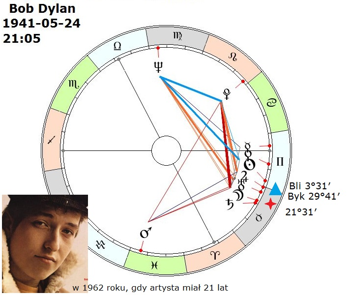 Tu jest horoskop Dylana. Zdjęcie przedstawia go jako 21-letniego młodzieńca. Karierę zaczął bardzo wcześnie. Na zdjęciu ma czapkę z daszkiem, którą z upodobaniem wtedy nosił. Bardzo piękny młodzieniec. Mam tę satysfakcję, że raz w życiu, też w bardzo dawnych czasach, byłem na jego koncercie na żywo i nie zapomnę. On wtedy już nie był młodzieńcem. Ja też nie byłem młodzieńcem. Było to dawno.