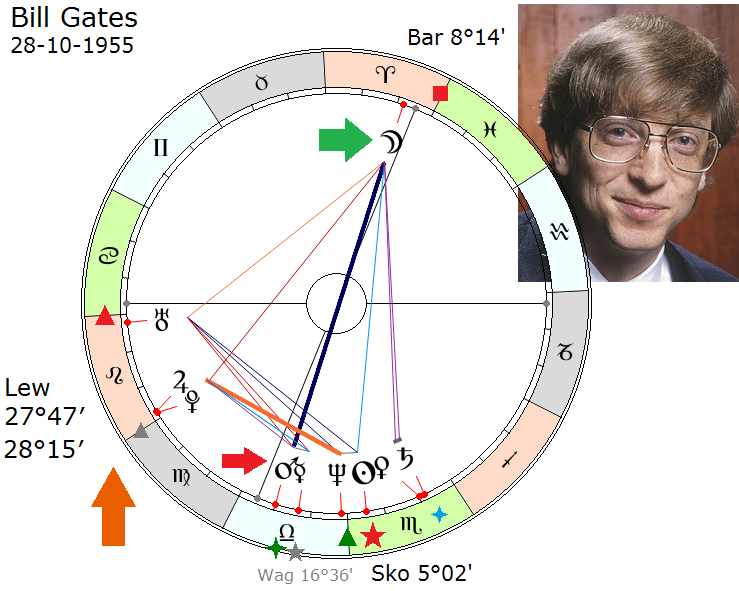 Drugi przykładowy wielki Amerykanin to Bill Gates. Tutaj co prawda nie ma 21 lat, ale bardziej 41, a może 51, nie wiem. W każdym razie jest to zdjęcie ze szczytu jego kariery, kiedy pchnął naprzód wielką machinę pod tytułem powszechna komputeryzacja ludzi na całym świecie. Co dokonało się w dużym stopniu dzięki niemu osobiście. Widzimy, że u niego jest podobnie. Wprawdzie Księżyc on ma w Medium Coeli, jest również mediocelikiem, jest tym, który obsadza światową karierę, co mu się znakomicie udało. Jego Księżyc w Baranie w okolicy Medium Coeli daje wyczucie tego, co ludzie chcą w skali powszechnej: jakie jest masowe ssanie, jaka jest masowa potrzeba, masowy popyt. I on to znakomicie wyczuł, tworząc swój system operacyjny dla komputerów osobistych. Po drugie, widzimy obsadzony znak Skorpiona, Słońce w ognistym punkcie pięciokrotnym Skorpiona – to mówię do tych, którzy znają się już na punktach harmonicznych, ale dla nas najważniejsze jest, że on również jest uranikiem, również jest ascendentykiem (którym nie był Dylan).