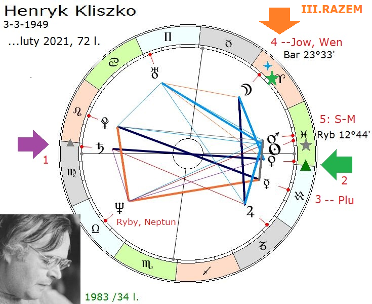 Henryk Kliszko, twórca schroniska na Otrycie i związanego z nim Klubu Otryckiego. Widzimy, że ma zajęty przez Saturna ascendent, ma potężnie obłożony descendent, gdzie ma Wenus, Słońce i Marsa, to wszystko w znaku Ryb. Ryba był straszna, jeśli chodzi o poruszanie się takim wężykiem w swoich decyzjach i w swoich życiowych wyborach.