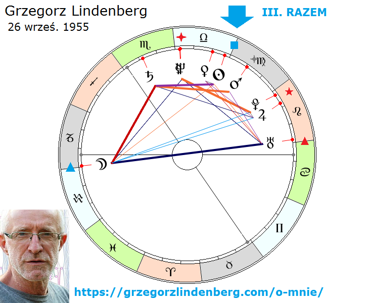 Lindenberg, prócz tego przeładowania trzeciej ćwiartki międzyosiowej, jest ascendentykiem, ponieważ w zasięgu ascendentu ma Księżyc. Księżyc jest w ciekawym punkcie: w Zero Wodnika, więc to nie jest taki Księżyc przylepa, tylko to jest Księżyc wychylony w przyszłość i w abstrakcję. Księzyc jest też negatywnie poparty opozycją od Urana, więc to jest jeszcze bardziej uraniczny Księżyc. Więc to nakierowanie na przyszłość jest tutaj, powiedziałbym, że aż gwiżdże w tym horoskopie, ale jest ascendentykiem i przez tę dominantę ascendentu on nie wpadał (jak śliwka w kompot) w kolektywy, tylko on te kolektywy tymi rękami budował, po czym z nich odchodził, bo jak widzimy nie ma planet w ćwiartce Dzieło. On nie trzymał tego, co zbudował, ani nie trzymał się kurczowo tego, co zbudował. Był budowniczym ludzkich zespołów, skutecznych, sprawnych, biznesowo również sprawnych. On o tym pisze na swojej stronie, warto przeczytać. Więc również tak ta dyspozycja w kierunku tego niby sekciarskiego trzymania się razem może być zrealizowana.