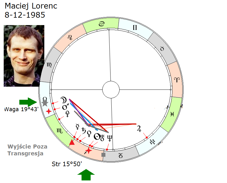 Innym znanym transgresykiem, znaczy już wyraźnie celującym w przyszłość i w fantazje, znaczy umieszczającym swoje fantazje, które uważał za konieczne i realne i umieszczał w przyszłości, był Karl Marx, który jak widzimy miał, podobnie jak Wałęsa, dla koniunkcji Słońca i Księżyca i podobnie jak Wałęsa w tej ćwierce, chociaż nie w środku, tylko bardziej na dole, ale jednak w jego horoskopie widać, że właśnie ten obszar transgresji, czyli wybiegania w wyobrażone fikcje i w przyszłość był ten obszar naładowany najsilniej.