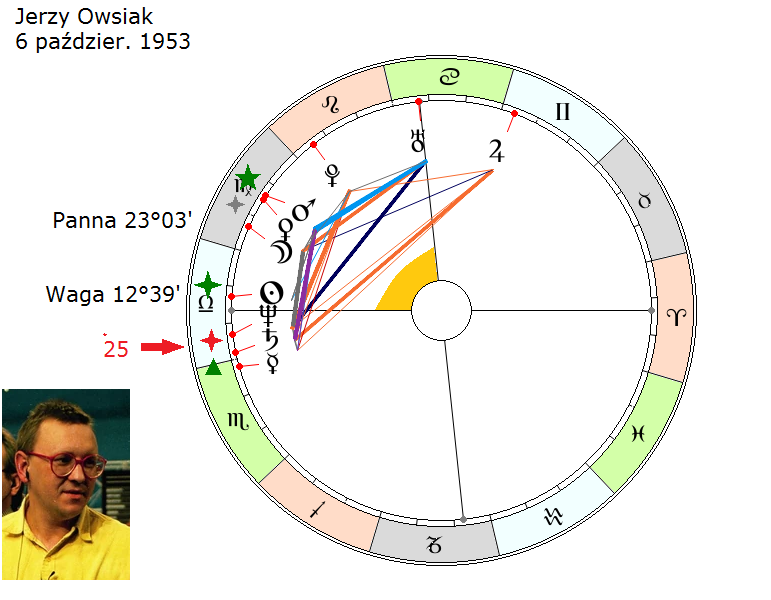 Zajrzyjmy do przykładów. Tu jest horoskop Jerzego Owsiaka. Jego zdjęcie jest również z czasów, kiedy dopiero swoje przedsięwzięcie pod tytułem Wielka Orkiestra Świątecznej Pomocy zaczynał, inicjował. Czyli tu jest jako młodzieniec, 30-40-letni. Słońce ma na ascendencie razem z Neptunem. W zasadzie cała ta grupa planet – Słońce, Neptun, Saturn, Merkury – jest skupiona wokół ascendentu. Dalej ma Księżyc, Wenus, Marsa i Plutona. I te cztery planety są położone wyraźnie w tym obszarze międzyosiowym „Otwracie”. Wśród nich jest jedno ze świateł, czyli Księżyc. Właśnie te planety aktywują ten obszar międzyosiowy i spowodowały, że Jerzy Owsiak zajął się, z wielkim rozmachem, szeroko zakrojoną działalnością publiczną.