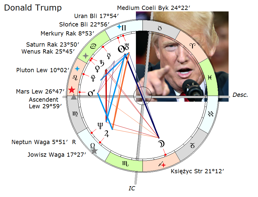 Drugim przykładem i bardzo charakterystycznym pod tym względem jest Donald Trump. Na zdjęciu widzimy, że jest w swoim żywiole: jest to zdjęcie z jego ulubionego zajęcia, mianowicie przemawia do tłumu, zapewne na jakimś wiecu przedwyborczym. On jest ascendentykiem, ma Marsa na ascendencie, ale prócz tego w sektorze „Otwarcie” ma Plutona, Wenus, Saturna, Merkurego, Słońce i Urana, czyli sześć planet, czyli więcej niż połowę planet, sześć na dziesięć ma w tym sektorze. Ma inne wyraziste wskaźniki osobowościowe w horoskopie, które go czynią takim, jakim on jest, natomiast ten zestaw planet w IV sektorze czyni go takim właśnie wziętym, skutecznym, zapalonym mówcą wiecowym, wiecowym agitatorem, czującym się jak ryba w wodzie w tej roli. Najwyraźniej była mu potrzebna w życiu od dawna, ponieważ gdyby poprzestał na swoim głównym zawodzie handlarza wielkimi i drogimi nieruchomościami, to nie miałby się gdzie popisywać, nie miałby gdzie użyć tej swojej mana, swojej mocy czy umiejętności przemawiania do tłumów, agitowania i ekscytowania tych tłumów, a to jest właśnie w czystej postaci przejaw tej ćwiartki.