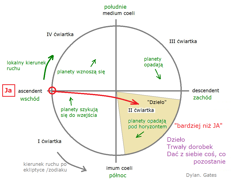 Podczas gdy ascendent mówił „ja, ja, moje, ja i moje”, prawda? – to obszar międzyosiowy pod descendentem, przed Imum Coeli, czyli druga ćwiartka, mówi o rzeczach, które są bardziej niż ja. A co jest bardziej niż ja? Bardziej niż ja, ale nadal w obrębie ja, jest trwały dorobek. Jest to to, co dana osoba, co dany człowiek zrobił, co wykonał i co jest trwałe.