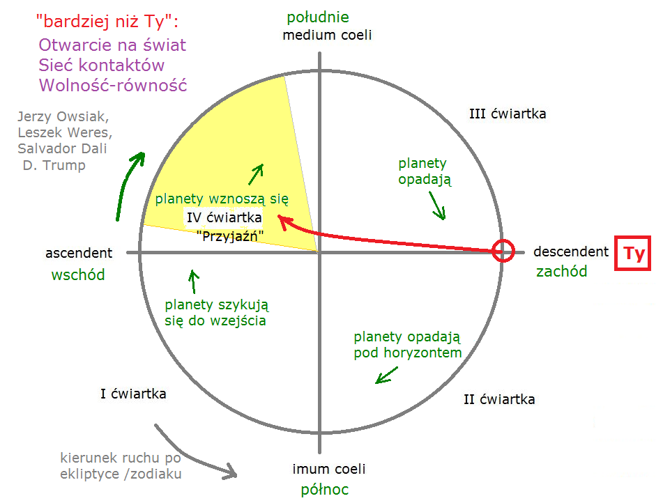 Przykładem jest Jerzy Owsiak, sztandarowa postać wśród polskich celebrytów, która to ma: szerokie otwarcie na świat, wejście w rozległą sieć kontaktów, również tworzenie tych kontaktów, budowanie tej przestrzeni. Leszek Weres, „ojciec-założyciel” polskiej astrologii odrodzonej po nocy wojenno-komunistycznej. Salwador Dalí... Oraz nasz obecny gwiazdor, czyli Donald Trump. Na określenie tej ćwiartki było lansowane przez Patrice’a Guinarda hasło „Przyjaźń”, ale ja wolę posługiwać się terminem „Otwarcie” – szerokie otwarcie na świat i ludzi.