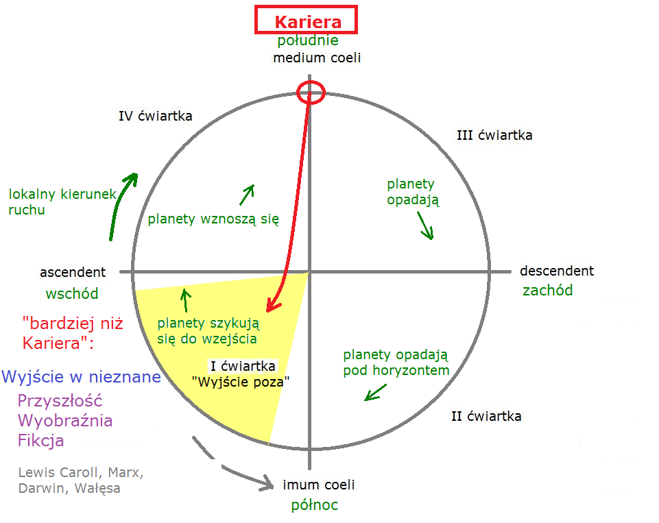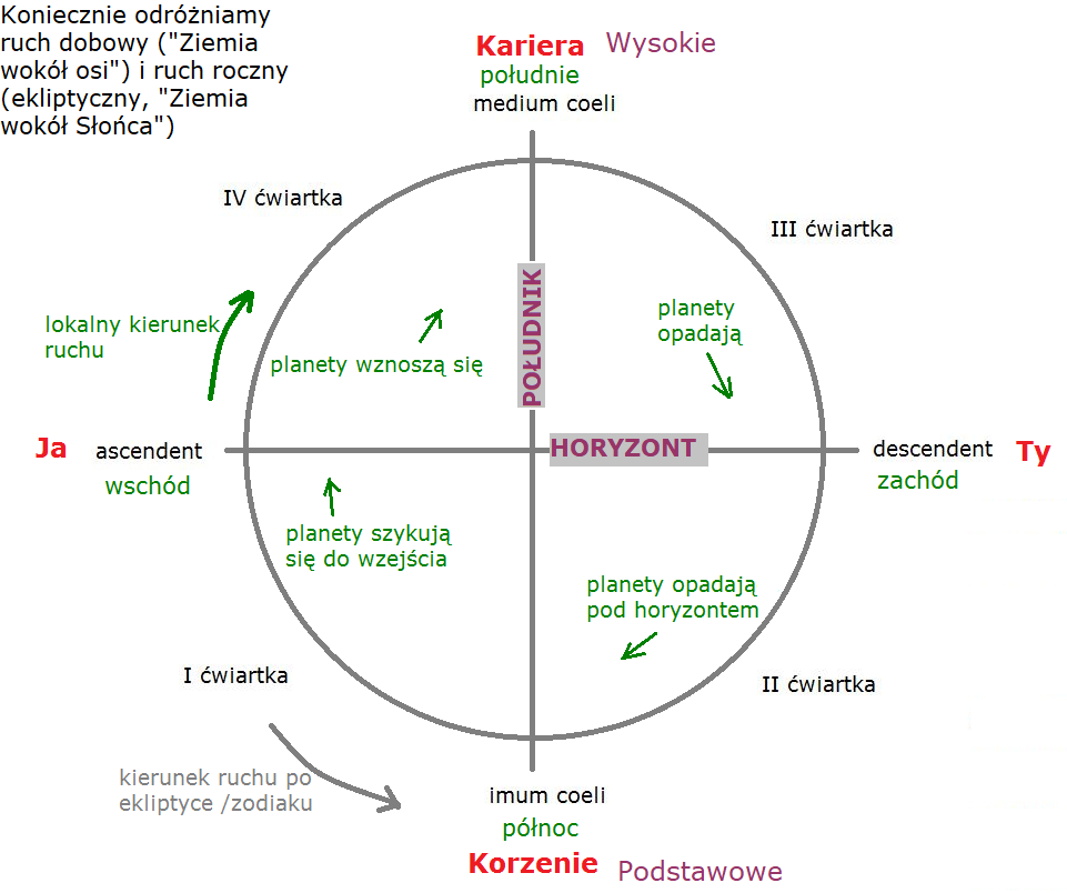 Zielonymi strzałkami oznaczone jest, co planety robią w poszczególnych miejscach tego schematycznego kosmogramu.Na ascendencie oczywiście planety wschodzą. Dalej planety wznoszą się, w miarę jak mija czas: 15 minut, pół godziny, godzina od wschodu planety. Planeta wznosi się nad horyzont, idzie coraz wyżej, a jednocześnie przesuwa się w kierunku południowym. (A na półkuli południowej w kierunku północnym.)