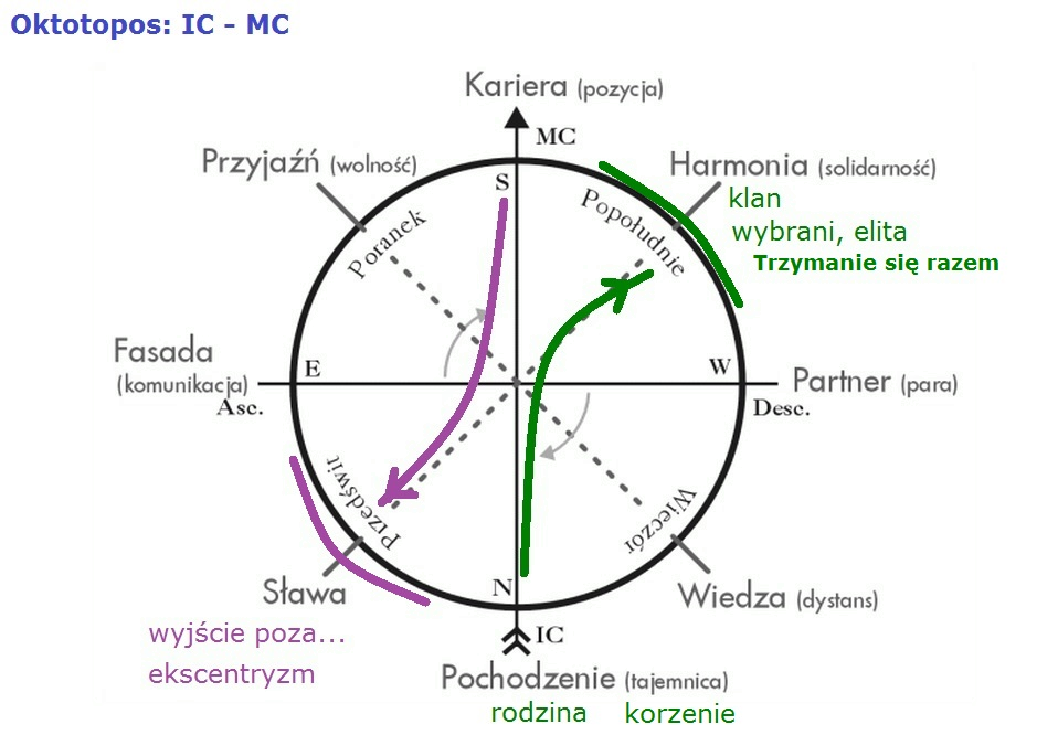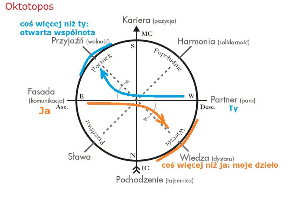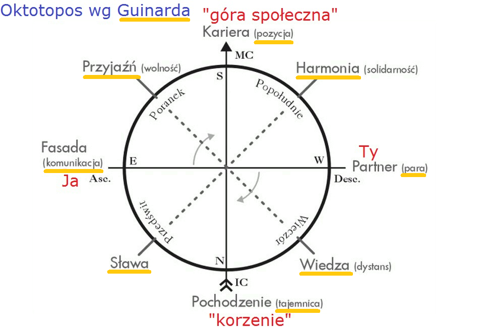 Mamy już dwie minuty przekroczenia czasu, więc spróbuję szybciutko. Cały ten system czterech osi i czterech obszarów międzyosiowych nazywany jest Octotopos, czyli osiem miejsc, bo tych wyróżnionych miejsc w horoskopie jest osiem. I jego ten system bywał próbowany przez starożytnych Greków, a jego takim wielkim odnowicielem w czasach całkiem niedawnych jest francuski autor Patrice Guinard.