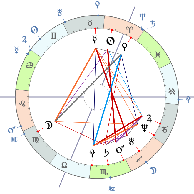 Przyglądam się horoskopowi na niepewną, ale pasującą mi godzinę 5-ą urodzenia. Dominanty: Pluton i Księżyc (położenie na osiach), Jowisz niezależnie od godziny urodzenia - wskazywany trygonem (2°s) przez Słońce. Pasuje do sławy i występów międzynarodowych. Do tego Ceres (umiędzynarodawiająca) w sekstylach do Jowisza i Słońca, czyli na wierzchołku bisekstyla. Jowisz w 9-m domu (na godz 5-ą urodzenia) pasuje do pewnej filozofii życiowej jaka jemu przyświeca (przejrzałam stronę podesłaną przez Miętę).Na godz 5-ą urodzenia Księżyc trygonami wskazuje stellum Merkury-Uran-Neptun. To stellum artystycznego (Neptun) i oryginalnego (Uran) wyrażania się (Merkury) poprzez sztukę (Neptun).Wenus jest w ścisłym decylu (0°01′) do dominującego Plutona i we władzy dominującego Jowisza (bo w Strzelcu). I w słabej (9°s) koniunkcji ze Słońcem i w słabym (10°s) trygonie z Księżycem. Też jest silna.Znaki ziemskie i Saturn (pracowitość, wytrwałość, praktyczność) są podkreślone położeniem współdominującego stellum Merkurowego w Koziorożcu, położeniem Saturna w swoim znaku oraz MC z Księżycem w Pannie (to ostatnie na godz 5-ą urodzenia).