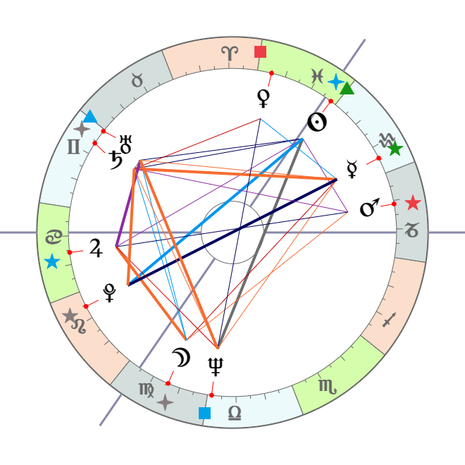 Nie wklejam kosmogramu bo nie umiem wpisać strefy i nie znalazłam żadnej informacji jak to zrobić. Jego natal robi wrażenie. Pluton w Skorpionie w ścisłym Mc. Ocena Roddena AA.