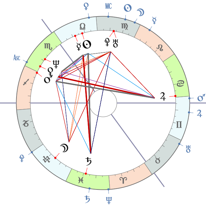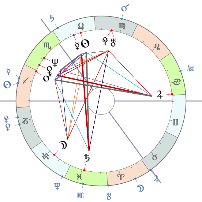 Jeszcze uzupełnię informacją o jego Ceres (27^42′R Koziorożec). Jest w ścisłym (0^33′) bikwintylu do Księżyca, Księżyc jest w ścisłym (0^06′) decylu do Jowisza, a Jowisz w ścisłym (0^22′) trydecylu do Ceres. Ceres jest również w sekstylu do Neptuna i w słabych trygonach do słabej koniunkcji Uran-Pluton.Nie znam znaczenia Ceres na tyle, aby coś z tego wywnioskować, ale podejrzewam, że jej wyraźne zaznaczenie w horoskopie może pozytywnie wpływać na jego lekkość pisania (poza koniunkcją Merkurego z Jowiszem w powietrznej Wadze).