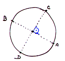 3. Na tym nie koniec. Kiedy mam te dwa punkty, A i B, leżące naprzeciw siebie, tym samym wyróżniamy na tle koła dwa następne punkty. Są to punkty, które leżą w równych odległościach od tamtych dwóch, w połowie dróg miedzy nimi. Te punkty C i D są także najdalej oddalone od A i od B, a linia C-D tworzy kąt prosty z linią A-B.