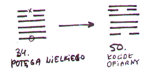 | Rys. 7. Przykładowy heksagram Księgi Przemian, który przez zmianę linii zmiennych przechodzi w inny heksagram |