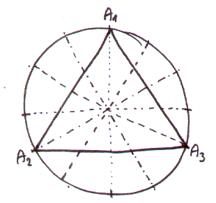 14. Czy w podobny sposób jak na czworo, koło można dzielić i na inne liczby? Tak, można. Można przecież wpisać w koło dowolny wielokąt foremny (trójkąt, pięciokąt i tak dalej), a to oznacza to samo. Ale... niekiedy taki podział na tym się nie kończy. Wyobraź sobie, że wpisujesz w koło (na przykład) trójkąt foremny, czyli dzielisz koło trzema punktami A1, A2, A3 na trzy równe sektory. Zauważ teraz, że każdy z tych punktów możesz uznać za "początek kola", tak jak to było opisane w paragrafie 1, i do tego punktu dobudować punkt przeciwległy, oraz dwa leżące w kwadraturach. Chciałeś podzielić koło na TRZY, a z rozpędu podzieliłeś je na 3 razy 4, czyli na DWANAŚCIE! Z podziału na TRZY wyszedł ci obraz, który bardzo przypomina zodiak.