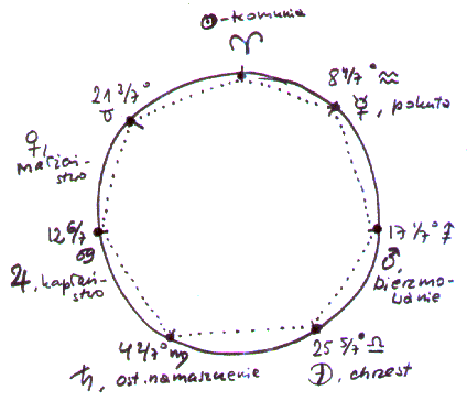 15. Kiedy koło ekliptyki, z zaznaczonymi punktami kardynalnymi, podzielimy jeszcze na TRZY, to znaczy do każdego punktu kardynalnego doczepimy trójkąt foremny wpisany w koło, otrzymamy zodiak.