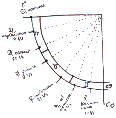 26. Widzimy, że Dwójki leżą w siedmiokrotnych punktach Wenus i Księżyca, odpowiadających sakramentom Małżeństwa i Chrztu. Kiedy Księżyc w swoim cyklu przechodzi przez te punkty, ludzie łączą się w grupy i silniej przejawiają się ich instynkty społeczne. Zgadza się to z najogólniejszym znaczeniem Dwójek, którym jest: zbieranie się razem, szukanie swojego dopełnienia.