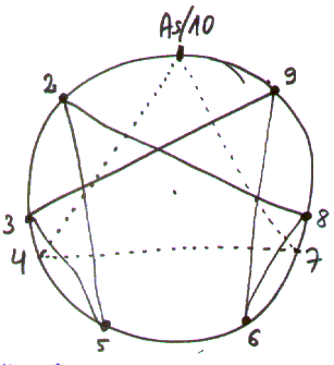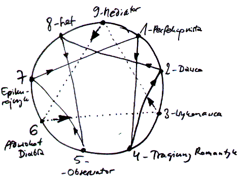 27. Dziewięć kart w jednym kolorze (Asa i Dziesiątkę uważamy nadal za jeden symbol) układa się na kole we wzór przypominający enneagram. Czym jest enneagram? Jest to system, którego odkrywcą (a może twórcą) był Gurdżijew, a który kontynuowali, rozwijali i badali Oscar Ichazo, Claudio Naranjo i Helen Palmer, jeśli wymienić tylko najbardziej zasłużonych. Słowo "enneagram", pochodzące z greckiego znaczy "wykres dziewięciu". Owe dziewięć punktów - wierzchołków enneagramu - ponumerowane jest od 1 do 9, ułożone są kolejno w kierunku ruchu wskazówek zegara (odwrotnie niż znaki zodiaku), i tworzą dwa cykle. Jeden składa się z punktów 9-6-3, czyli liczb podzielnych przez 3; na drugi składają się punkty 1-4-2-8-5-7. Ta sekwencja liczb powtarza się w dziesiętnym zapisie ułamka "jedna siódma": 1/7= 0.142857142857... Badacze enneagramu przyporządkowywali jego (ponumerowanym) wierzchołkom różne zespoły znaczeń. Najbardziej znanym enneagramem jest enneagram typów charakteru. Według psychologów-enneagarmistów każdy z ludzi jednoznacznie należy do jednego z dziewięciu typów przyporządkowanych wierzchołkom enneagramu. Typy te są następujące: