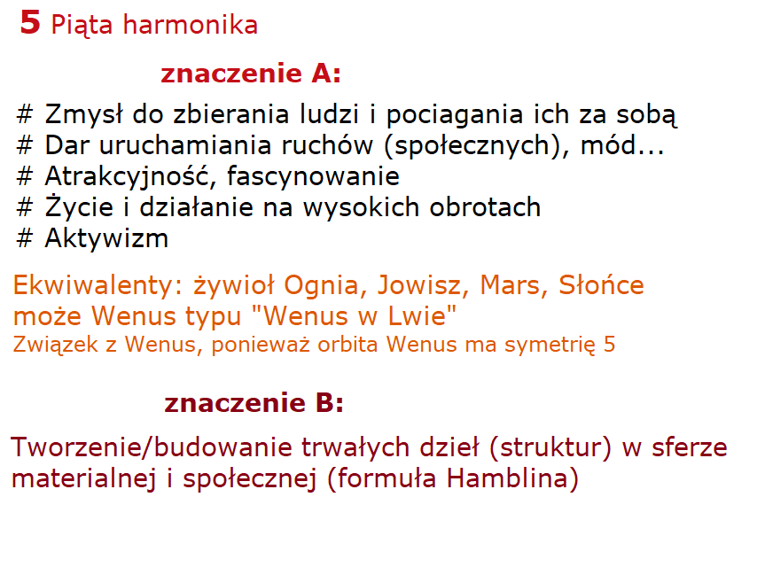 Ekwiwalenty piątej harmoniki, to żywioł ognia przede wszystkim, do tego Jowisz oczywiście, do tego Mars oczywiście, do tego Słońce również oczywiście, i od wzbudzania fascynacji Wenus, Wenus najchętniej oddziałująca z tymi planetami ognistymi, Jowiszem, Marsem, Słońcem, no więc Wenus typu Wenus w Lwie. (Znakiem Wenus, wśród znaków ognistych, jest znak Lwa.) Również występuje związek z Wenus, ponieważ orbita Wenus ma symetrię liczby 5. Co mniej więcej 1 piątą nieba, czyli co mniej więcej 72 stopnie, pojawiają się punkty, w których coś się dzieje między Wenus i Słońcem, np. ich koniunkcje albo inne charakterystyczne cechy ruchu orbitalnego Wenus widzianej z Ziemi względem Słońca.