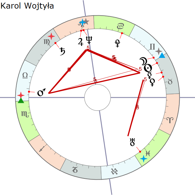 Widzimy więc pewne podobieństwa. W piątej harmonice jest aktywowany Uran, co prawda nie w pierścieniu, tylko obok, ale jest. Do pierścienia należą Jowisz i Neptun, które w przypadku Wojtyły są w koniunkcji. Ta koniunkcja jest w medium coeli i sprzęga się także ze Słońcem i Księżycem, które były na przełomie Byka i Bliźniąt, czyli w punkcie zero Bliźniąt. Wojtyła nie był w takim razie Bykiem, w sensie charakterologicznym, tylko był Bliźniętami i to dużo bardziej wytłumacza jego kontaktowość, jego wszechstronność, jego poliglotyzm również. W każdym języku potrafił coś powiedzieć, a cztery lub pięć znał biegle.