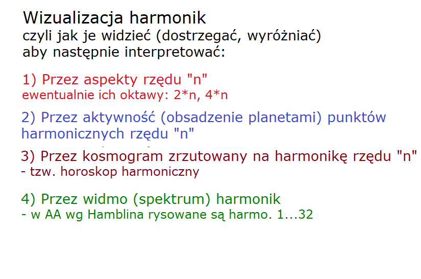 Następnie odróżniamy przez drugi punkt, przez aktywność, czyli obsadzenie planetami punktów harmonicznych rzędu n. Tę metodę mamy rozwiniętą w zasadzie tylko dla trzech harmonik, to znaczy harmoniki trzeciej, 5-tej i 7-mej. Trzecia harmonika wyróżnia nam znaki zodiaków, a szczególnie ich początki, które są właśnie punktami harmonicznymi rzędu 3. Prócz tego kiedyś zauważyłem, że podobnie można wprowadzić punkty harmoniczne rzędu 5 i 7. I to jest używane jako standard w horoskopach Astroakademii. Te punkty widać jako kolorowe znaczki na obwodzie kosmogramu. Więc jeśli ktoś ma wiele planet w zasięgu tych punktów, to może też uważać jest za część danej harmoniki.