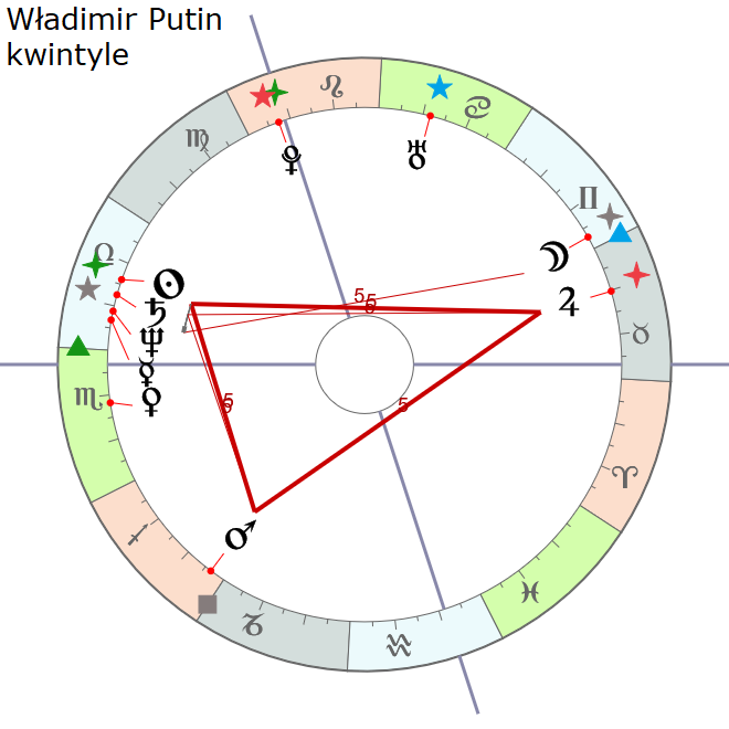 I co on ma? Ma pierścień kwintyli. To jest też ważne, gdyż kiedy badamy kwintyle, to zwracamy uwagę na to, czy układają się w pierścienie. I w przypadku Adolfa układają się planety w piękny pierścień, dla którego kiedyś zaproponowałem nazwę palec Orca. Orc, pisane przez C, to jest takie bóstwo ognia, trochę szatańskie, ale nie całkiem..., wymyślone, a może odkryte, bo może bogowie są, gdzieś tam bytują i niektórym się objawiają, a niektórzy je odkrywają. I został odkryty... Orc został odkryty przez Williama Blake´a, który zresztą też taki pierścień miał w swoim horoskopie. Ale u Blake´a ten układ planet nie jest aż tak charakterystyczny, jak u Adolfa H.