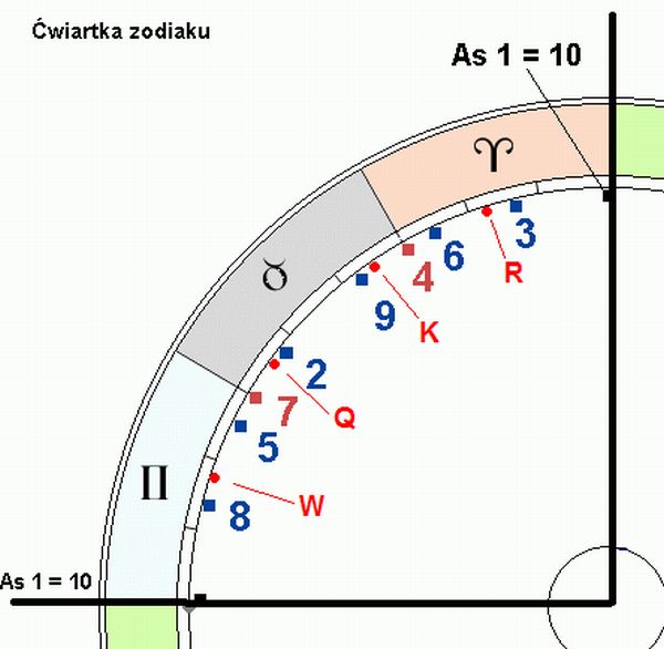 Dalszym ciągiem tamtego schematu fali tarota jest ten rysunek, gdzie kolejne punkty harmoniczne są rozmieszczone na tle ćwiartki ekliptyki/zodiaku. Przechodzimy teraz do czwórek, czyli początków znaków stałych.