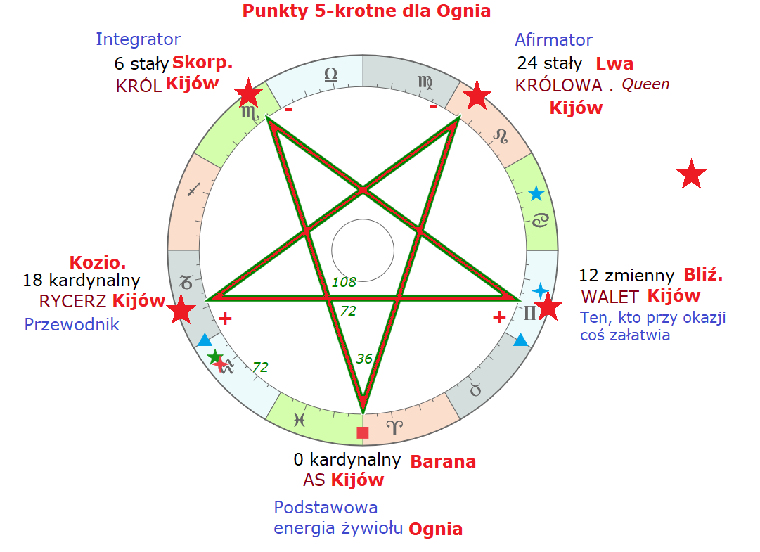 Następny punkt – integratora Króla – jest w 6° Skorpiona i tam to jest też punkt ognisty i marsowy, który służy scalaniu przedsięwzięć. Następnie punkt afirmujący: 24° Lwa, czyli Królowa kijów: to jest hiper-Lew. To jest ten Lew, który kocha siebie, uwielbia być podziwianym, uwielbia stać w środku albo na scenie, albo w świetle reflektorów, albo jedno i drugie i wszystkie, wzrok wszystkich na mnie... – i to się sprawdza w realnych postaciach.