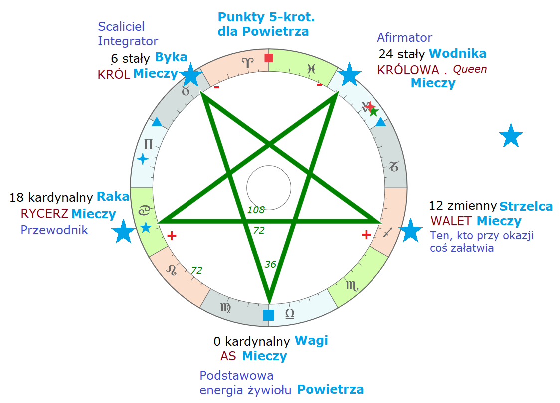 Następne są punkty pięciokrotne dla powietrza. Asem jest zero Wagi, Rycerzem Mieczy i punktem przewodnikiem jest 18 stopień znaku kardynalnego; ten punkt przewodnika wypada w znaku Raka, ale ponieważ jest powietrzny, to ma mnóstwo cech Wodnika. To jest jakby wyspa Wodnika w znaku Raka. Raki z okolic osiemnastego stopnia Raka są futurystyczni, przyszłościowi, i właśnie w przeciwieństwie do Raków typowych, którzy są uwikłani w przeszłość, oni patrzą w przyszłość, są miłośnikami nowinek, które zaprowadzają na swoim terenie, często rodzinnym, często są takimi delegatami rodziny w przyszłość, w kierunku rozwoju. Ale nie tylko rodziny. Tu się wiele ciekawego dzieje i też radzę sobie obejrzeć, kto ze sławnych ludzi miał tutaj Słońce albo Księżyc albo Merkurego.