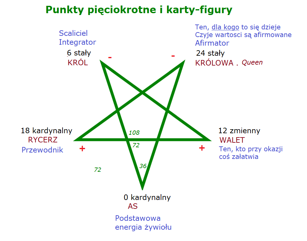Punkty pięciokrotne utożsamiamy z kartami-figurami. Dlaczego? W tym jest pewna głęboka nieprzypadkowość. Punkty pięciokrotne skojarzamy i utożsamiamy jako ich ekwiwalenty z kartami-figurami, ponieważ w teorii Tarota mówi się, że karty-figury mówią o ludziach, a mówiąc jeszcze bardziej ogólnie: o sytuacjach, kiedy pewna tendencja albo pewna energia zechce się wcielić w osobę, gdzie pewna osoba występuje jako żywy, działający, historyczny reprezentant czy reprezentantka pewnej energii.