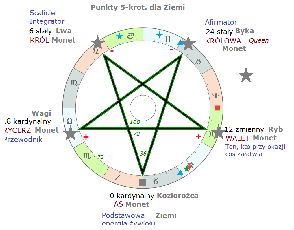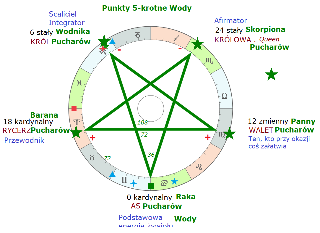 Nie rysowałem jeszcze zodiaku, zodiak będzie za chwilę. Na razie pokazuję stałą strukturę pięciu punktów, a właściwie czterech, dlatego że punkt kardynalny nie jest ani piątkowy, ani trójkowy, ani czwórkowy, jest po prostu podstawowy i wchodzi do każdego układu punktów harmonicznych, więc faktycznie punktów pięciokrotnych mamy cztery. Te punkty są cztery, co przypomina fakt, że w kartach Tarota karty poszczególnego rodzaju są też po cztery w jednym kolorze karcianym.