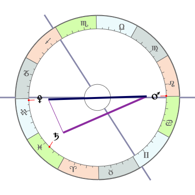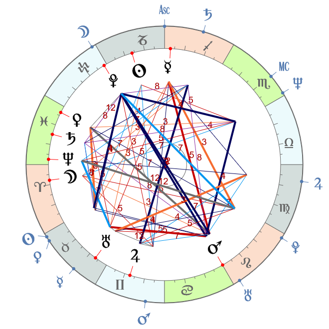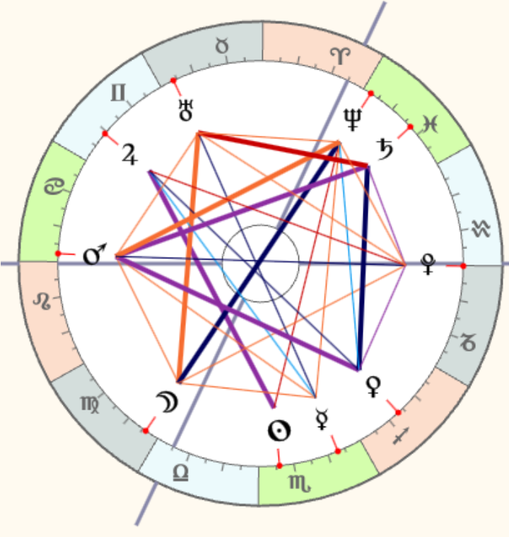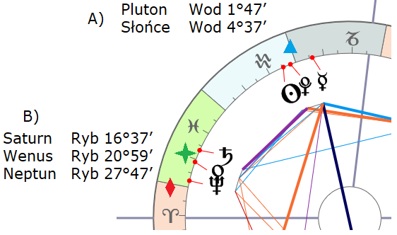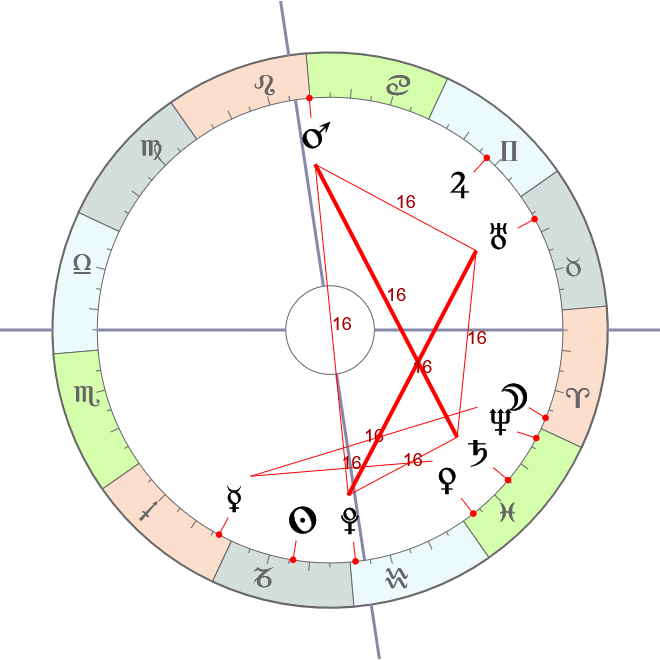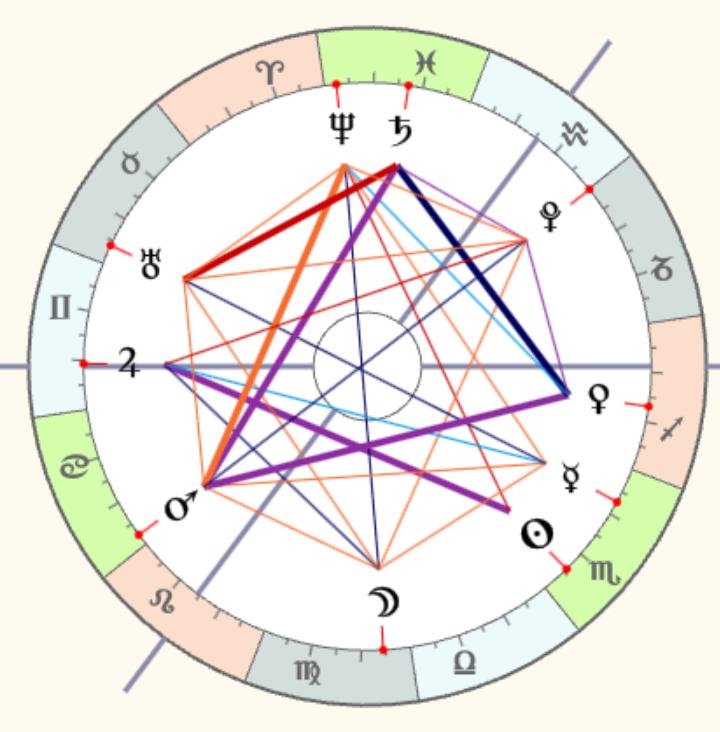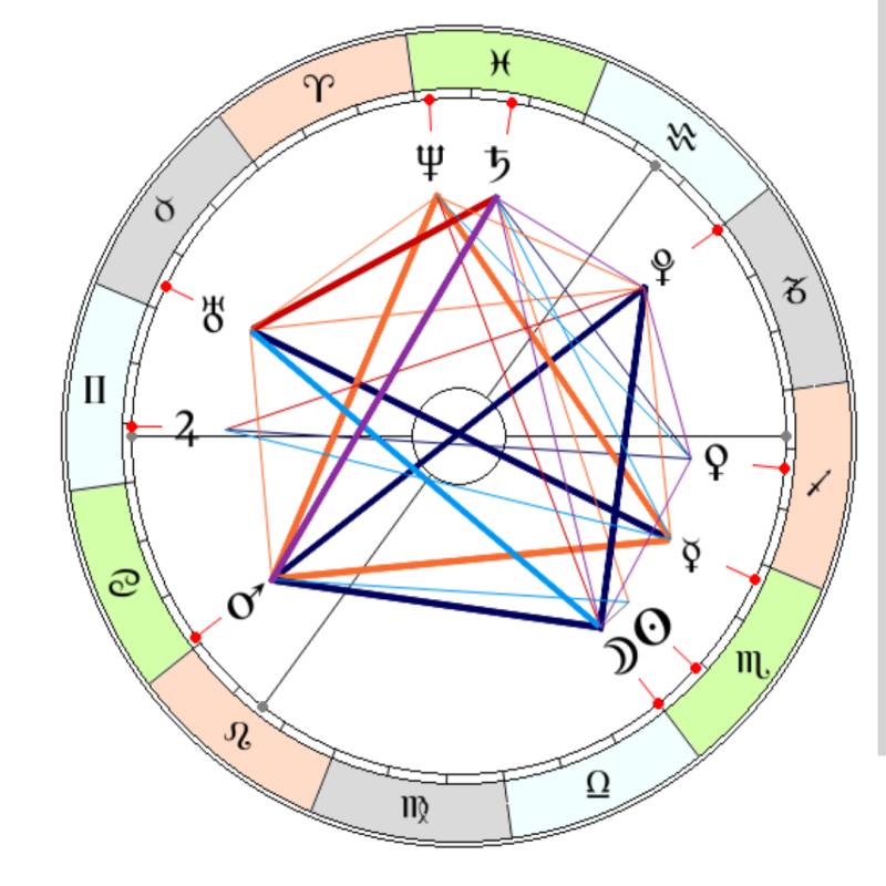 w kwinkunsie (od Słońca) i półsekstylu (od Księżyca) do Urana, a Uran jest w kwintylowym pierścieniu łączącym Marsa i Saturna (sytuacja pełna napięcia/katastrofa);
