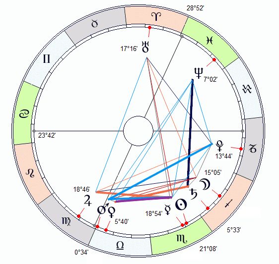Jak widać, furia morderców została uruchomiona przez dołowanie Marsa (przejście przez oś imum coeli). Mars tworzył bi-septyl (aspekt 2/7, niebieska linia) z Plutonem, a także septyl ze Słońcem. Być może ten pierścień septyli znaczeniowo odpowiada za tę zbrodnię. Co oznaczałoby, że przy prognozowaniu należy większą uwagę zwracać na septyle. Znaczące jest też wzmocnienie pozycji Marsa przez jego przejście przez punkt kardynalny Wagi. W tym kontekście Waga to nie rzekoma „chodząca zgoda”, tylko źródło grupy znaczeń nazywanych w skrócie żywiołem powietrza, któremu w tarocie odpowiada kolor Mieczy. Tutaj ujawniła się gwałtowna strona żywiołu powietrza i jego punktu kardynalnego. Na tym tle kwadratura Saturna do Neptuna wydaje się czynnikiem pobocznym.